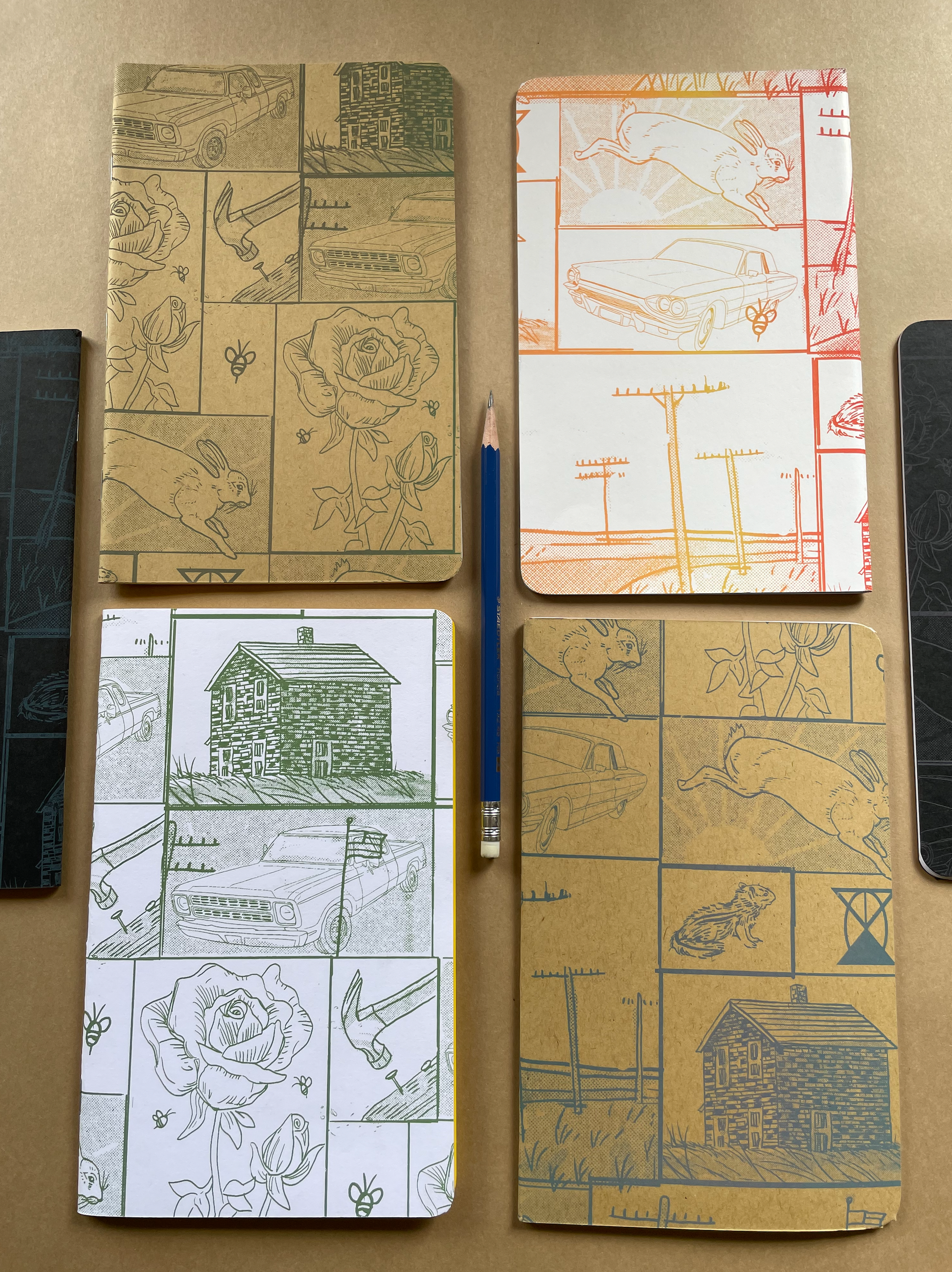 Made from recycled screenprinted gigposters/art prints/test prints. Insides are plain blank pages. All hand made and assembled.