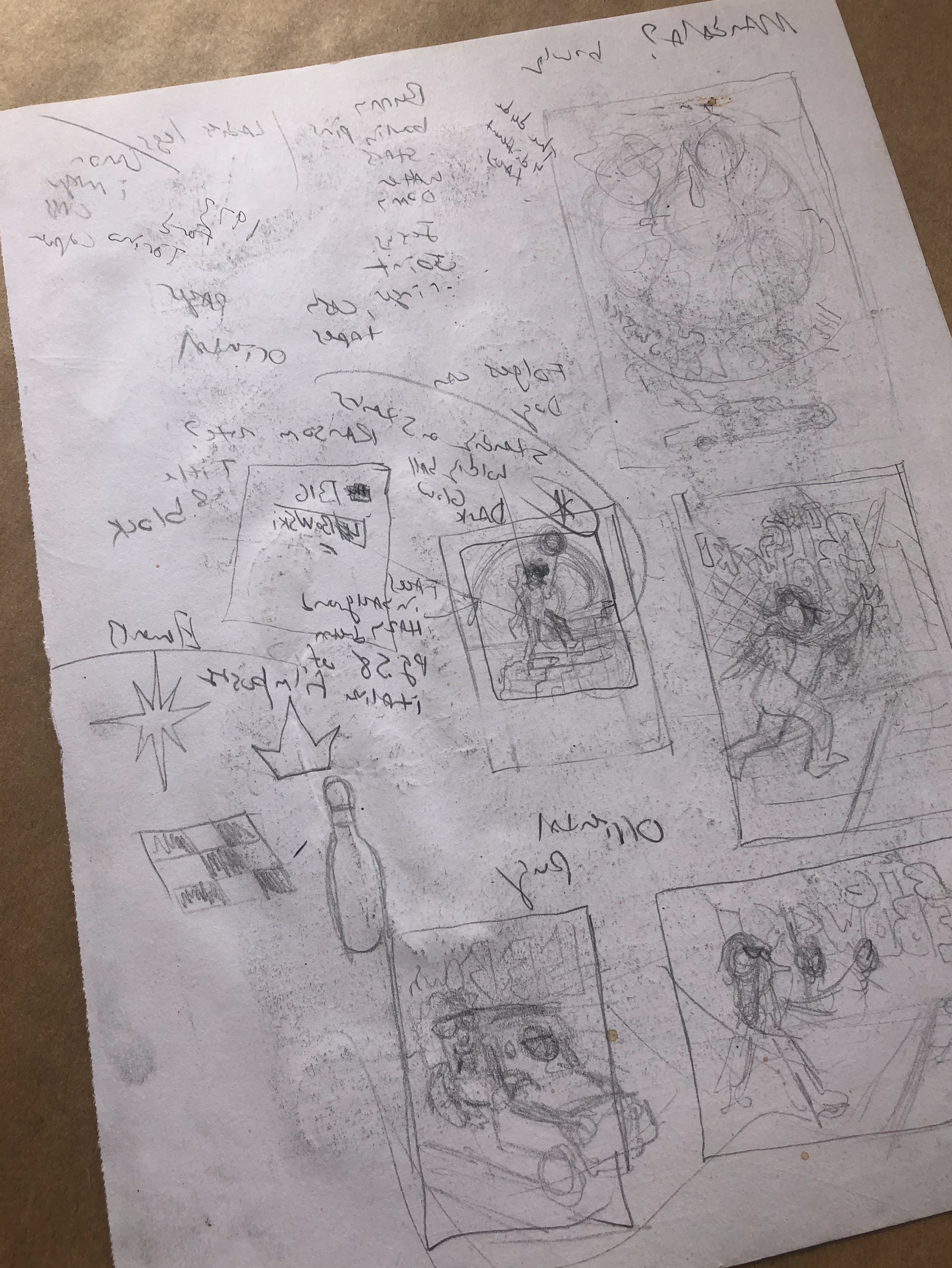 Sketchbook brainstorming that eventually led to the final Big Lebowski poster for Mad Duck 2018. Has some scribbles and various notes on the back of the page.