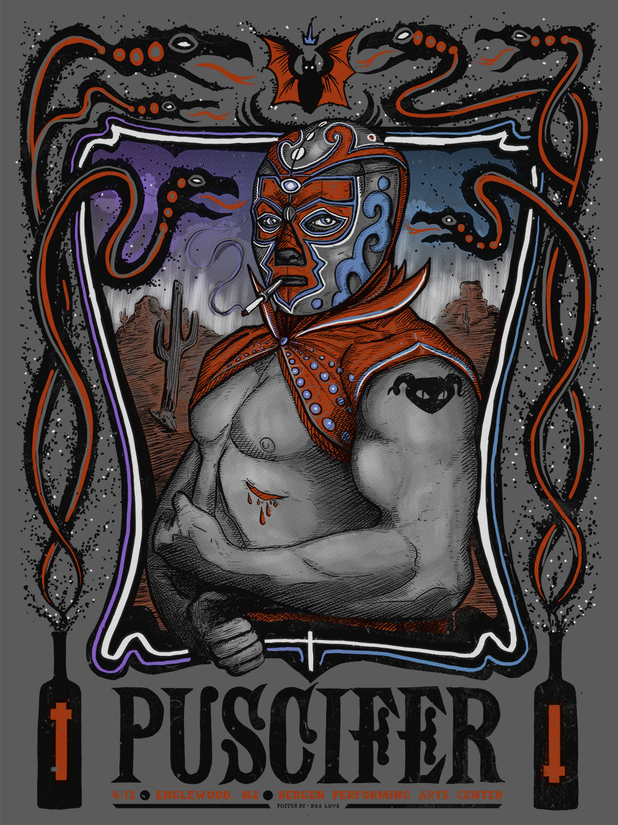 Variant gigposter created for Puscifer's show on April 12, 2016 at Bergen Performing Arts Center.